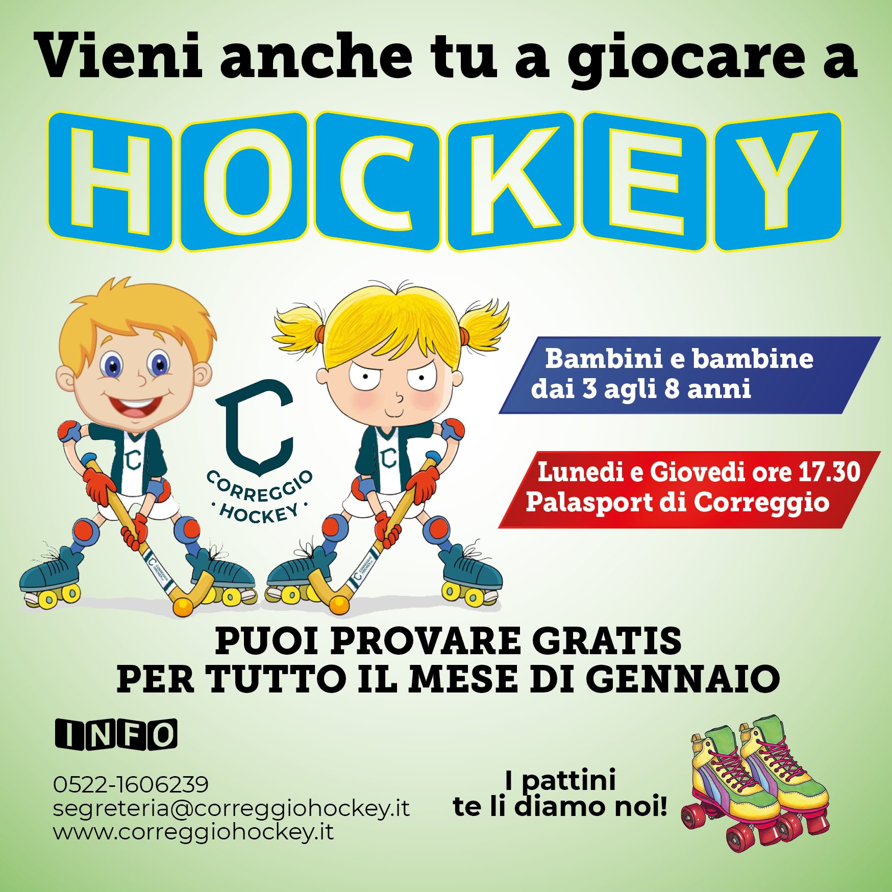 Hockey Club Correggio ti propone un corso di avviamento al pattinaggio e all’hockey su pista per bambini di età compresa tra i 3 e gli 8 anni. Organizziamo due corsi paralleli: uno per i maschi uno per le femmine.
