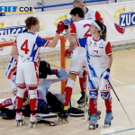 Una gara equilibrata nella quale non sono mancati i momenti di difficoltà, con il Thiene che si era riavvicinato minacciosamente nel corso del secondo tempo alla formazione biancorossoblu che però ha saputo reggere l’urto e poi reagire. Una prova importante superata da parte della squadra di Jorge Bastias, che ha iniziato la partita con una certa decisione anche se Nicolò Salines è stato impegnato dopo pochi istanti di gara su diverse conclusioni del vicentino Giorgio Casarotto. Malgrado l’esordio in Serie A2 per cinque giocatori della Minimotor (Salines, Righi, Caroli, Casari e Ferrari), i giovani del Correggio Hockey hanno saputo tenere la pista creando non pochi problemi all’estremo difensore ospite Nicola Comin. Il quale non ha potuto nulla invece sul tiro di Edoardo Righi, al 18’, che ha saputo sfruttare la ribattuta di una conclusione fallita da Ferrari e insaccare la pallina alle spalle dell’estremo veneta. Raddoppio firmato da Casari che, dopo i due gol segnati in Serie A1, si è confermato anche nella categoria inferiore segnando un tiro diretto (dopo aver subito fallo da Ballardin). Nella ripresa, dopo due buoni interventi di Salines su Sperotto e Casarotto, è Caroli a trovare la via della rete per il 3-0 con un tiro dalla distanza deviato da Conzato. Lo stesso giocatore veneto ha provato a rifarsi ma non c’è stato nulla da fare, anche se il cartellino blu a Orfei ha permesso al Thiene di sfruttare la superiorità numerica e trovare il gol dell’1-3 (Casarotto da pochi passi). L’ingresso di Francesca Maniero ha dato stabilità alla squadra, che ha subito il gol del 2-3 con Sperotto a sette giri di lancette dalla fine dopo la pallina persa da Caroli.